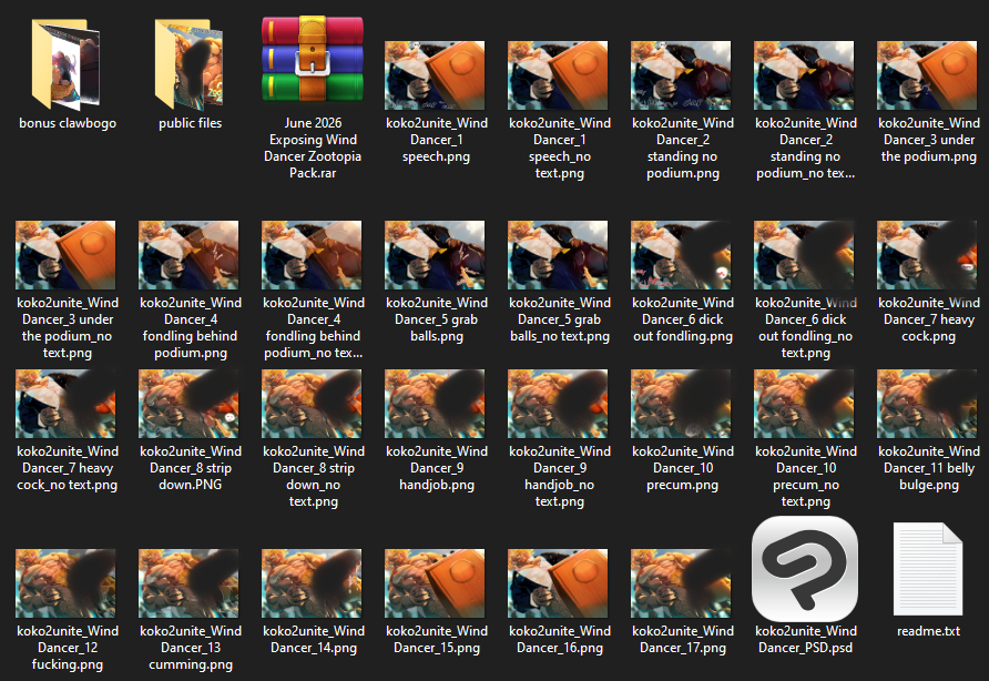 There are 17 alts with 10 no text variants, total of 27 image files, featuring Mayor Wind Dancer getting exposed! A PSD file is included if you want to mix and match the variants I made, or for study (wink wink). I also added some bonuses of 3 doodles of Clawbogo I made several years ago.